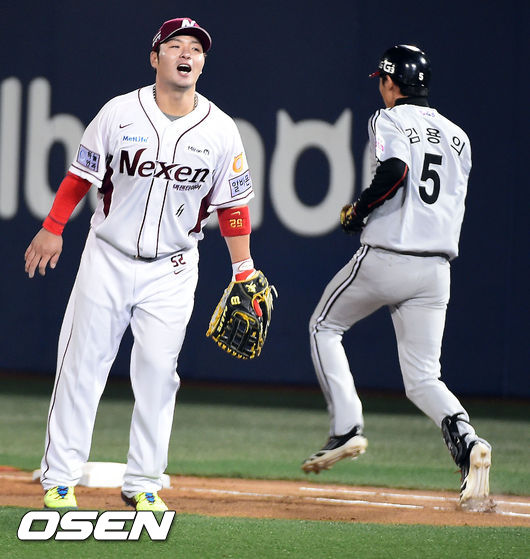 27일 오후 서울 목동야구장에서 열린 '2014 한국야쿠르트 세븐 프로야구' 넥센 히어로즈와 LG 트윈스의 플레이오프 1차전 경기,3회초 무사 1,2루 LG 김용의의 내야안타때 전진수비 펼친 박병호가 아쉬워하고 있다