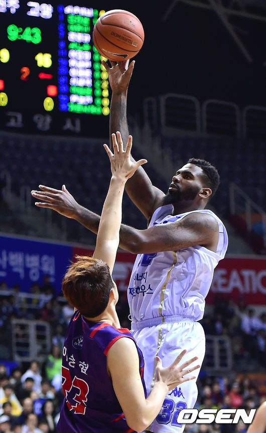 27일 오후 경기도 고양실내체육관에서 '2014-2015 KCC 프로농구' 고양 오리온스와 전주 KCC의 경기가 열렸다. 2쿼터 KCC 월커슨이 골밑슛을 시도하고 있다. 고양 오리온스는 전주 KCC를 상대로 개막 8연승에 도전한다. 만약 오리온스가 승리할 경우 역대 개막 후 최다연승 공동 1위를 달성하게 된다. 아울러 KBL 사상 최초의 1라운드 전승에 도전할 기회를 얻게 된다. 역대 개막 후 최다연승은 2011-2012시즌 동부가 세웠던 8연승이다. 당시 동부는 KT와의 1라운드 마지막 경기서 68-76으로 패하며 최초의 1라운드 전승이 아쉽게 불발됐다. 이 시즌의 동부는 정규리그 역대 최강팀으로 남아있다. 당시 동부는 44승 10패로 정규리그 최다승, 81.5%의 정규리그 최고승률, 정규리그 역대최다 16연승 기록까지 동시에 달성한 무적의 팀이었다. KCC는 최장신 센터 하승진이 지키는 골밑이 위력적이고, 김태술이 부상에서 회복되면서 좋은 경기력을 보이고 있다. 외국선수 타일러 윌커슨과 디숀 심스의 기량도 좋은 편이다. / youngrae@osen.co.kr