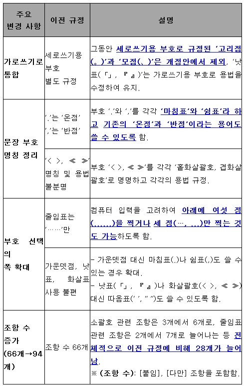 이번 개정안에서는 가로쓰기를 기준으로 문장 부호의 용법을 정비해 '온점'과 '반점'으로 부르던 부호 '.'과 ',' 대해 각각 '마침표'와 '쉼표'라고 하고 기존에 부르던 이름도 쓸 수 있게 했다. 또한 '줄임표'를 다양한 형태로 쓸 수 있게 하는 등 사용자 편의와 활용성을 높이는 데 역점을 뒀다.