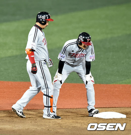 3회초 무사 만루에서 LG 이병규가 역전 1타점 적시타를 날렸지만 2루에서 선행주자 박용택을 추월하며 아웃되고 있다.
