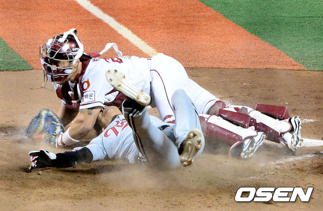 3회초 무사 만루에서 LG 이병규의 역전 1타점 적시타에 2루 주자 김용의가 넥센 박동원에 태그아웃 당하고 있다.