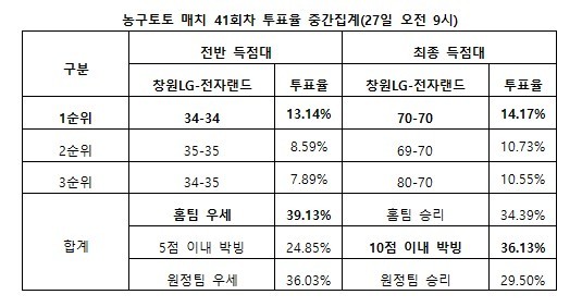 홈 팀 창원 LG의 승리에 투표한 농구팬이 34.39%로 뒤를 이었고, 나머지 29.50%는 전자랜드의 승리를 전망했다.