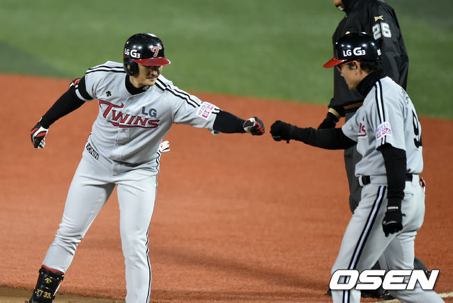 5회초 1사 1루에서 LG 박용택이 우전안타를 날리고 김민호 코치와 주먹을 맞대고 있다.