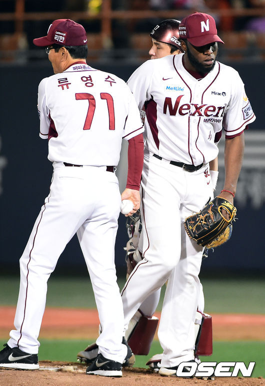 27일 오후 서울 목동야구장에서 열린 '2014 한국야쿠르트 세븐 프로야구' 넥센 히어로즈와 LG 트윈스의 플레이오프 1차전 경기,5회초 넥센 선발투수 소사가 강판되고 있다. 소사는 현재 4⅓이닝 3실점 패전위기를 기록하고 있다.