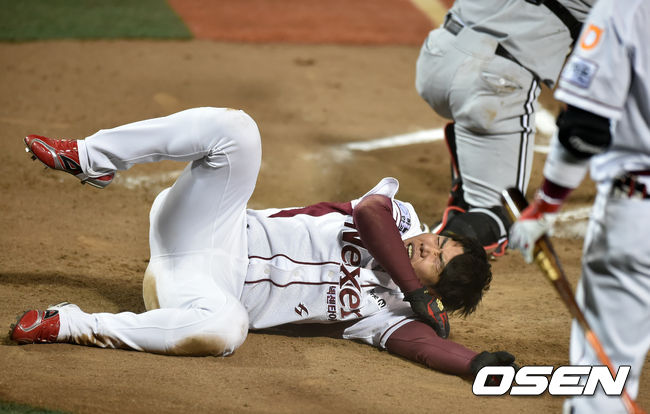 6회초 무사 1,2루에서 넥센 이성열의 적시타에 강정호가 홈에서 LG 최경철과 충돌하며 괴로워하고 있다. 합의판정 결과 세이프.