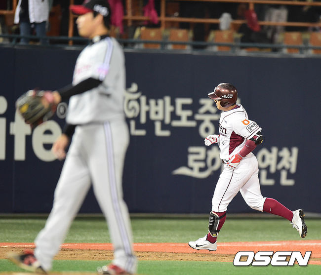 6회말 넥센 공격 1사 2, 3루 상황 대타 윤석민이 LG 투수 정찬헌을 상대로 역전 우월 스리런포를 날리고 그라운드를 돌고 있다.