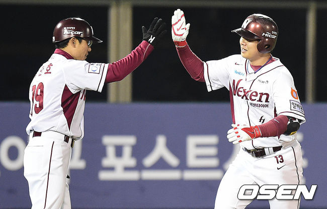 6회말 넥센 공격 1사 2, 3루 상황 대타 윤석민이 LG 투수 정찬헌을 상대로 역전 우월 스리런포를 날리고 그라운드를 돌며 최만호 코치와 인사를 나누고 있다.