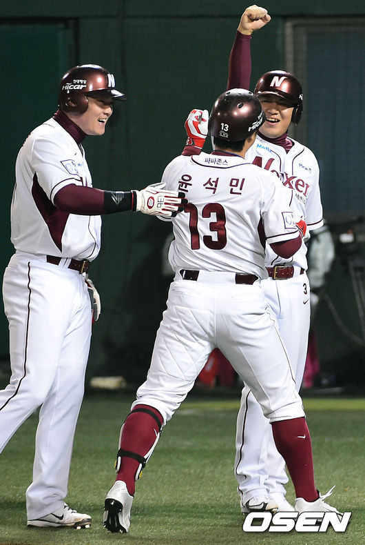 27일 오후 서울 목동야구장에서 열린 '2014 한국야쿠르트 세븐 프로야구' 넥센 히어로즈와 LG 트윈스의 플레이오프 1차전 경기, 6회말 1사 2,3루 넥센 윤석민이 역전 3점 홈런을 날리고 주자들과 기뻐하고 있다.