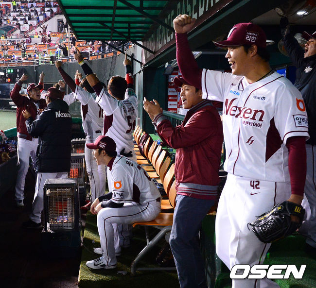 27일 오후 서울 목동야구장에서 열린 '2014 한국야쿠르트 세븐 프로야구' 넥센 히어로즈와 LG 트윈스의 플레이오프 1차전 경기, 6회말 1사 2,3루 넥센 윤석민의 역전 3점 홈런때 기뻐하는 넥센 더그아웃.