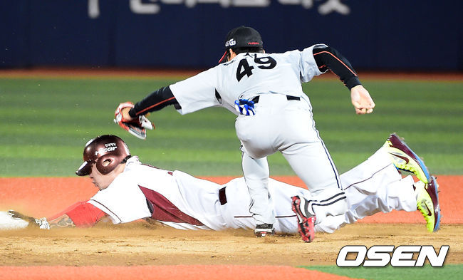 27일 오후 서울 목동야구장에서 열린 '2014 한국야쿠르트 세븐 프로야구' 넥센 히어로즈와 LG 트윈스의 플레이오프 1차전 경기, 7회말 1사 1루 넥센 강정호의 타석때 1루 주자 박병호가 도루 실패하고 있다.