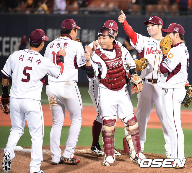 넥센은 27일 목동구장에서 열린 ‘2014 한국야쿠르트 세븐 프로야구’ LG와의 플레이오프 1차전서 대타 윤석민의 역전 스리런포에 힘입어 6-3으로 승리했다. 넥센은 경기 초반 1-3으로 끌려갔지만 윤석민의 홈런 포함 6회 4득점으로 역전에 성공하며 1승을 선점했다.