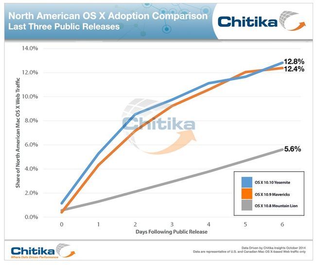치티카 조사에 따르면 OS X 10.10 '요세미티'는 6일 만에 12.8% 적용률을 보이면서, 지난 OS X인 메버릭스의 기록을 뛰어넘었다.