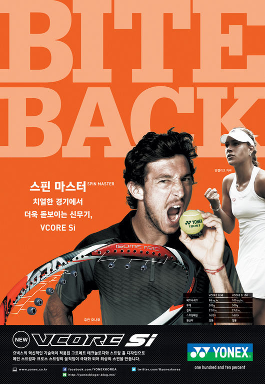 또 요넥스 코리아의 VCORE Si 시리즈는 스트링 표면에 공이 머무르는 시간을 증가시켜 자연스러운 홀딩감은 물론 다양한 각도에서 상대를 공격할 수 있도록 도와준다. 라켓 프레임의 상단 양쪽에는 탄력적인 소재인 카본 그라파이트와 탄성 입자를 조합했다. 여기에 그립에서부터 라켓 중앙 부분까지 이어진 차세대 3D벡터 샤프트가 향상된 라켓 표면의 안정성을 제공한다.