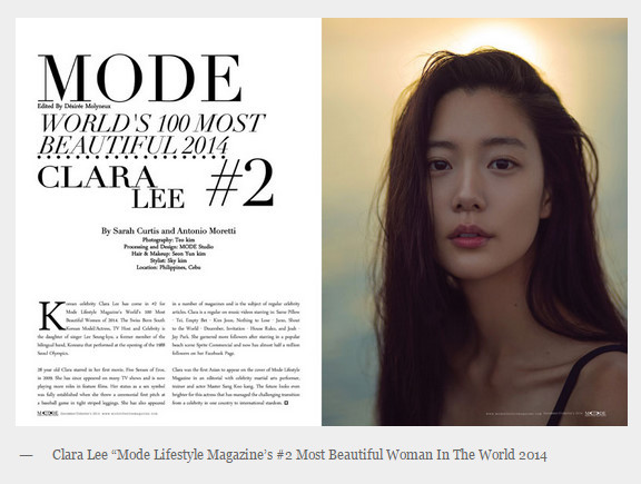 모드는 클라라가 ‘레깅스 시구’를 통해 섹시스타로 자리매김했다고 소개하며 “클라라는 모드 라이프스타일 아시아 최초의 매거진 표지모델이다. 한 나라의 유명인에서 국제적인 스타덤에 오른 만큼 이 배우의 미래는 더 밝아보인다”라고 긍정적으로 평가했다.