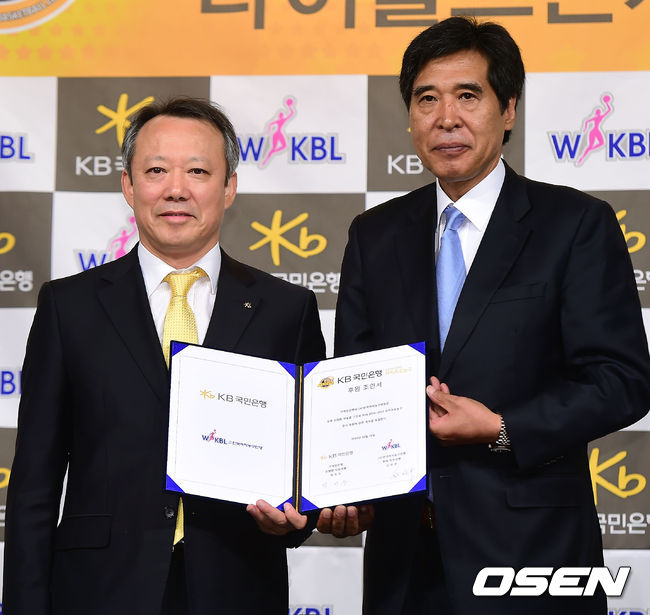 'KB 국민은행 2014-2015 여자프로농구' 미디어데이 및 타이틀 스폰서 조인식 행사가 28일 서울 청담동 리베라호텔에서 열렸다. KB국민은행 박지우 은행장 대행(왼쪽)과 WKBL 신선우 사무총장이 타이틀 스폰서 조인서를 들고 포토타임을 갖고 있다. 미디어데이에는 6개 구단 감독 및 팀의 대표 선수가 참가해 시즌 출사표 및 각오를 밝힐 예정이다. 지난 시즌이 종료된 이후 새로운 감독이 선임된 구단은 신한은행(정인교 감독)과 하나외환(박종천 감독)이다. 2014-2015 여자프로농구는 내달 1일 개막해 이듬해 3월 말까지 약 5개월간의 대장정에 들어간다. KB스타즈와 KDB생명이 맞붙는 개막전은 1일 오후 2시 청주 실내체육관에서 열린다. / youngrae@osen.co.kr