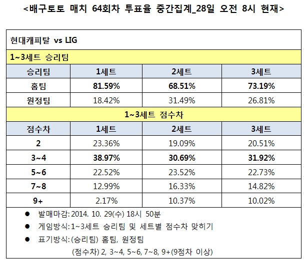 국민체육진흥공단(www.kspo.or.kr)이 발행하는 체육진흥투표권 수탁사업자인 스포츠토토의 공식 온라인 발매사이트 베트맨(www.betman.co.kr)은 오는 29일 천안유관순체육관에서 열리는 2014-2015시즌 V-리그 현대캐피탈-LIG전을 대상으로 하는 배구토토 매치 64회차 게임 투표율 중간집계 결과, 배구팬들은 현대캐피탈이 LIG를 상대로 우세한 경기를 펼칠 것으로 예상했다.