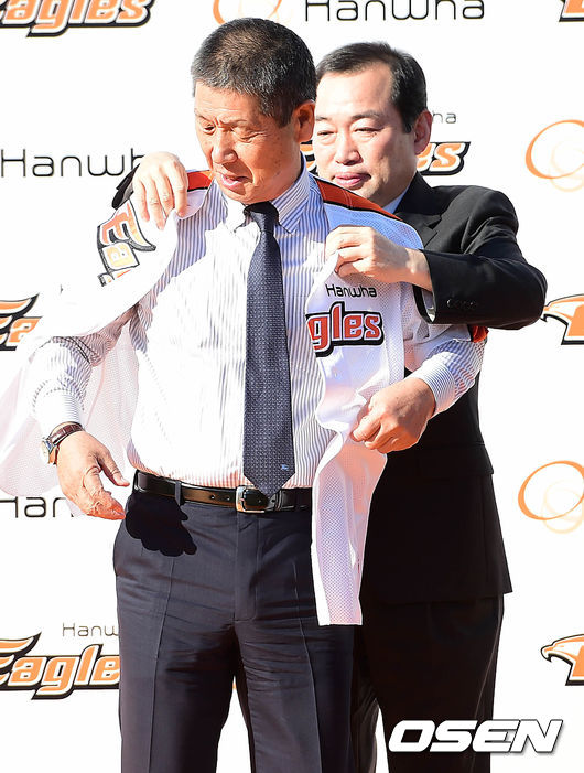 28일 오후 대전구장에서 '한화 이글스 김성근 신임 감독 취임식' 이 열렸다. 김성근 감독이 한화 정승진 사장으로 부터 유니폼을 전달받고 있다.