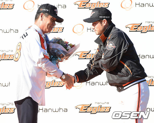 28일 오후 대전구장에서 '한화 이글스 김성근 신임 감독 취임식' 이 열렸다. 김성근 감독이 선수단 주장 한상훈과 인사를 나누고 있다.