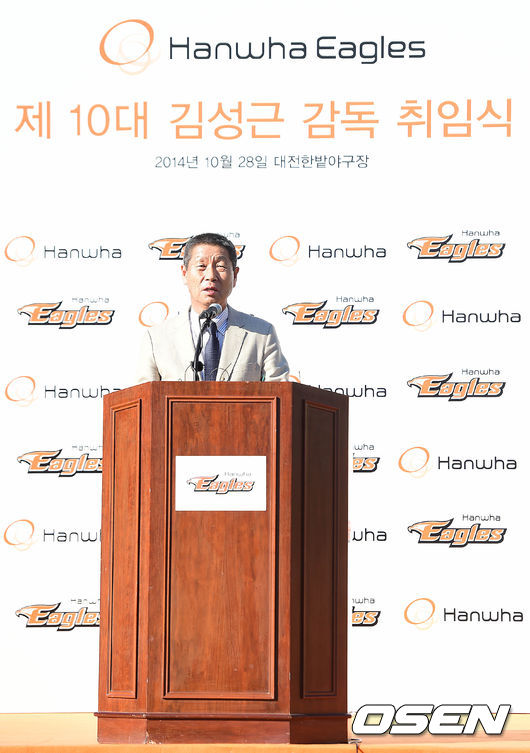 28일 오후 대전구장에서 '한화 이글스 김성근 신임 감독 취임식' 이 열렸다. 김성근 감독이 취임사를 하고 있다.