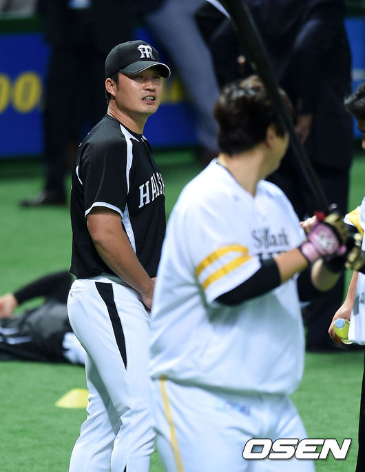 28일 오후 일본 후쿠오카현 후쿠오카 야후오크돔에서 열릴 2014 일본프로야구 일본시리즈 3차전 소프트뱅크 호크스와 한신 타이거즈의 경기에 앞서 한신 오승환과 소프트뱅크 이대호가 이야기를 나누고 있다.