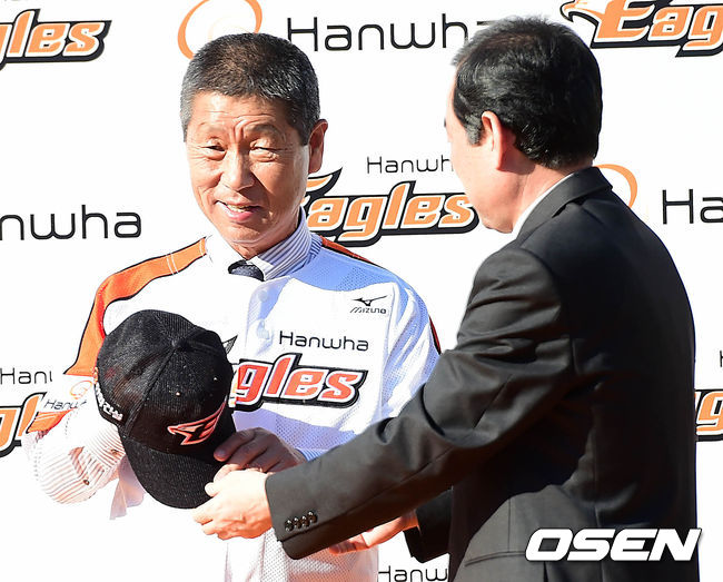 28일 오후 대전구장에서 '한화 이글스 김성근 신임 감독 취임식' 이 열렸다. 김성근 신임 한화 감독이 정승진 대표로부터 유니폼과 모자를 전달받고 있다.