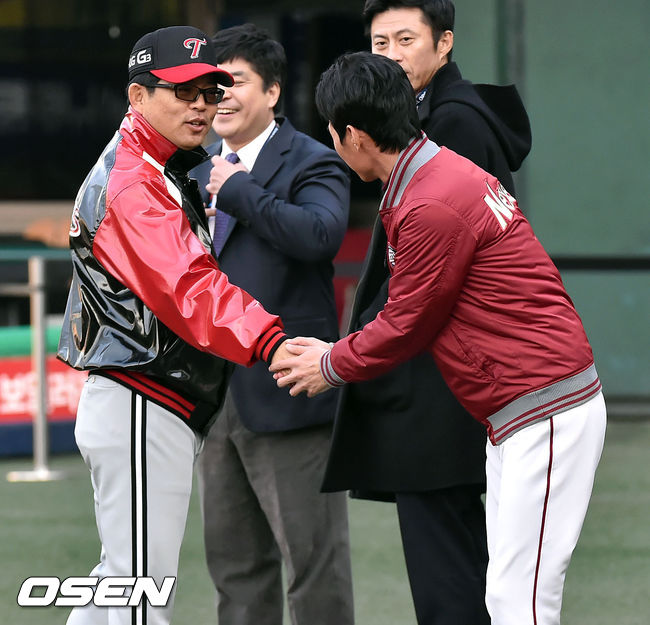 28일 오후 서울 목동구장에서 열리는 한국야쿠르트 세븐 프로야구 플레이오프 2차전 넥센과 LG의 경기에 앞서 염경엽 감독이 LG 양상문 감독과 이야기를 하고 있다.