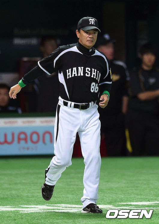 경기에 앞서 한신 와다 유타카 감독이 그라운드로 나가고 있다.