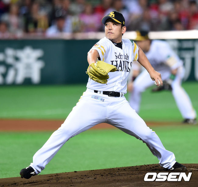 1회초 무사에서 소프트뱅크 오토나리 겐지가 힘차게 공을 던지고 있다.