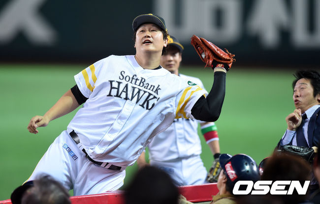 1회초 1사에서 소프트뱅크 이대호가 한신 우에모토 히로키를 파울플라이로 처리하고 있다.