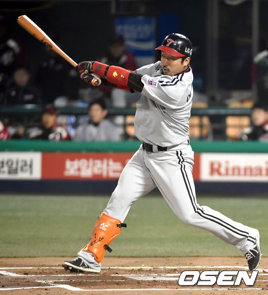 28일 오후 서울 목동구장에서 열린 한국야쿠르트 세븐 프로야구 플레이오프 2차전 넥센과 LG의 경기, 2회초 무사 이병규가 안타를 치고 있다.