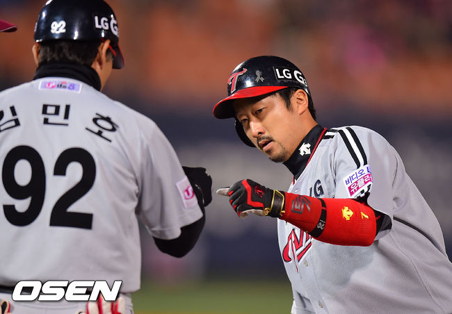 28일 오후 서울 목동구장에서 열린 한국야쿠르트 세븐 프로야구 플레이오프 2차전 넥센과 LG의 경기, 2회초 LG 선두타자 이병규가 안타를 날리고 김민호 코치와 하이파이브를 하고 있다.