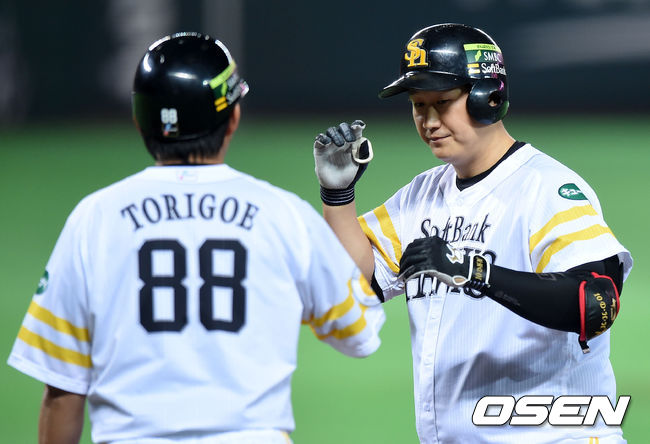 1회말 1사 2루에서 소프트뱅크 이대호가 우전 안타를 치고 환호하고 있다.