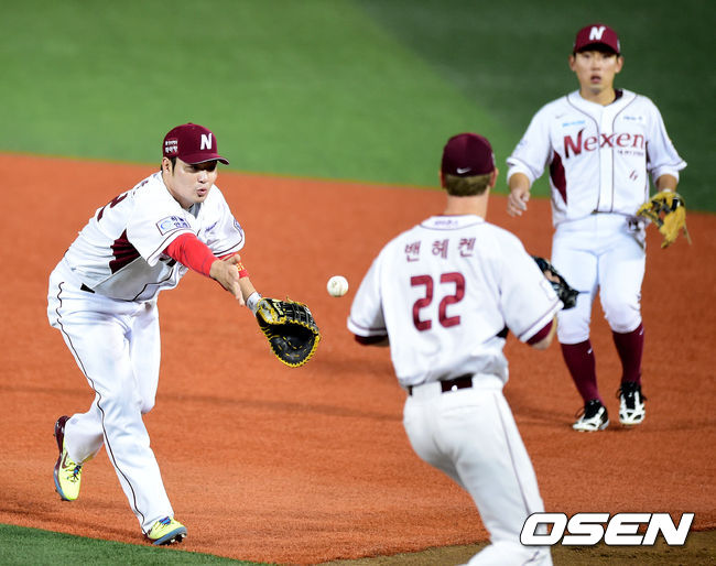 [OSEN=목동, 지형준기자] 28일 오후 서울 목동구장에서 열린 '2014 한국야쿠르트 세븐 프로야구' 넥센 히어로즈와 LG 트윈스의 플레이오프 2차전, 2회초 무사 1,2루에서 넥센 박병호가 LG 스나이더의 1루 땅볼을 잡아 베이스 커버를 들어 온 밴 헤켄에 토스하고 있다.