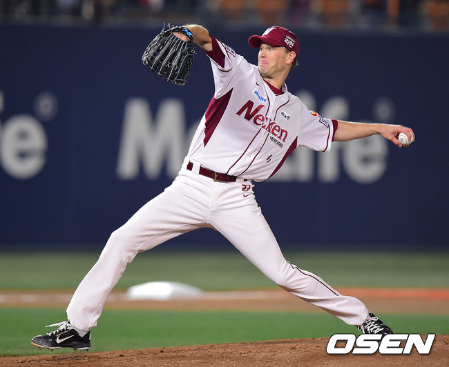 28일 오후 서울 목동구장에서 열린 한국야쿠르트 세븐 프로야구 플레이오프 2차전 넥센과 LG의 경기,2회초 넥센 선발투수 밴헤켄이 역투하고있다