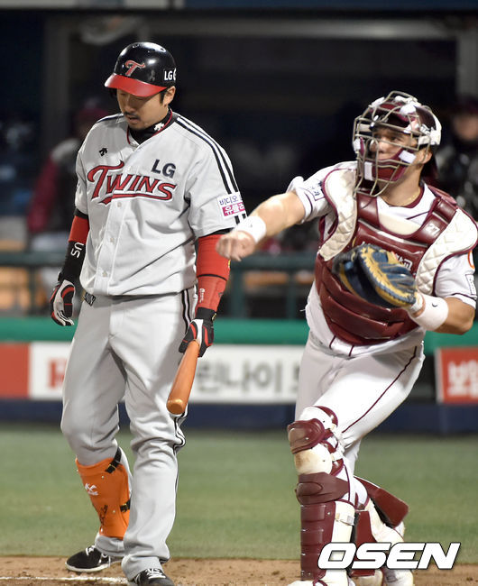 28일 오후 서울 목동구장에서 열린 한국야쿠르트 세븐 프로야구 플레이오프 2차전 넥센과 LG의 경기, 이병규가 루킹 삼진을 당하고 아쉬워 하고 있다.