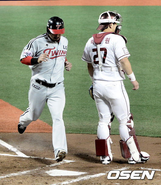 [OSEN=목동, 지형준기자] 28일 오후 서울 목동구장에서 열린 '2014 한국야쿠르트 세븐 프로야구' 넥센 히어로즈와 LG 트윈스의 플레이오프 2차전, 2회초 1사 2,3에서 LG 손주인의 내야땅볼에 3루 주자 이병규가 홈을 밟으며 선취 득점에 성공하고 있다.