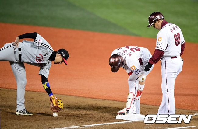 [OSEN=목동, 지형준기자] 28일 오후 서울 목동구장에서 열린 '2014 한국야쿠르트 세븐 프로야구' 넥센 히어로즈와 LG 트윈스의 플레이오프 2차전, 3회말 2사에서 넥센 박동원이 유격수 땅볼을 날리고 1루에서 LG 정성훈이 볼을 놓치며 세이프되고 있다.
