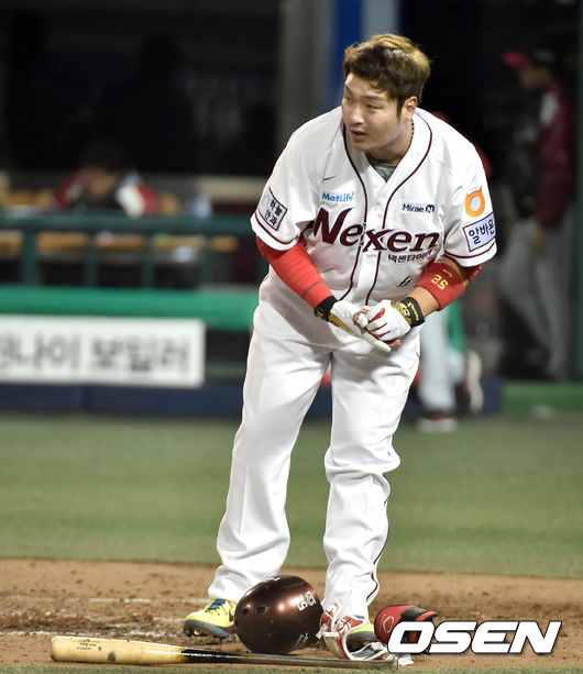 28일 오후 서울 목동구장에서 열린 한국야쿠르트 세븐 프로야구 플레이오프 2차전 넥센과 LG의 경기, 박병호가 두 번째 타석에서 삼진으로 물러나고 있다.