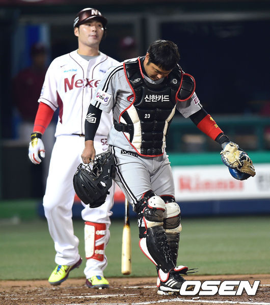 28일 오후 서울 목동구장에서 열린 한국야쿠르트 세븐 프로야구 플레이오프 2차전 넥센과 LG의 경기, 4회말 LG 최경철 포수가 넥센 박병호의 타석때 홈플레이트 흙은 쓸어내고 있다.