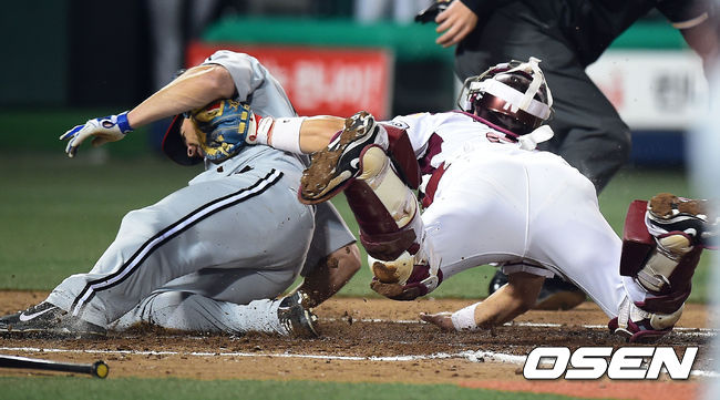 28일 오후 서울 목동구장에서 열린 한국야쿠르트 세븐 프로야구 플레이오프 2차전 넥센과 LG의 경기, 4회말 1사 2,3루 LG 오지환의 1루 땅볼 때 3루 주자 스나이더가 홈에서 세이프되고 있다.