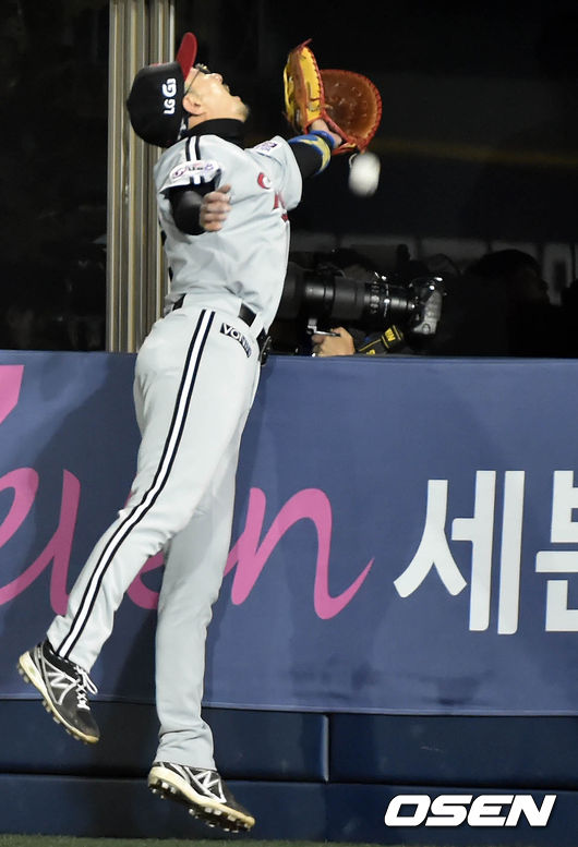 28일 오후 서울 목동구장에서 열린 한국야쿠르트 세븐 프로야구 플레이오프 2차전 넥센과 LG의 경기,5회말 강정호의 파울타구를 정성훈이 놓치고 있다.