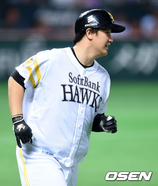 3회말 1사 1루에서 소프트뱅크 이대호가 좌전 안타를 치고 그라운드를 달리고 있다.