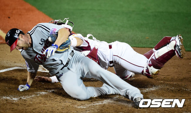 [OSEN=목동, 지형준기자] 28일 오후 서울 목동구장에서 열린 '2014 한국야쿠르트 세븐 프로야구' 넥센 히어로즈와 LG 트윈스의 플레이오프 2차전, 5회초 1사 2,3루에서 LG 스나이더가 오지환의 1루땅볼에 홈에서 넥센 박동원의 태그에 앞서 세이프되고 있다.