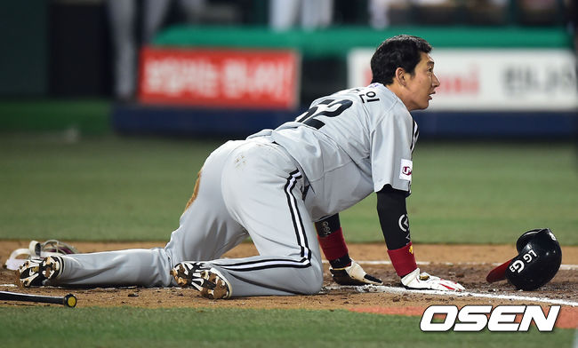 28일 오후 서울 목동구장에서 열린 한국야쿠르트 세븐 프로야구 플레이오프 2차전 넥센과 LG의 경기, 4회말 1사 2,3루 LG 오지환의 내야 땅볼 때 2루 주자 손주인이 홈에서 태그아웃된 뒤 아쉬워하고 있다