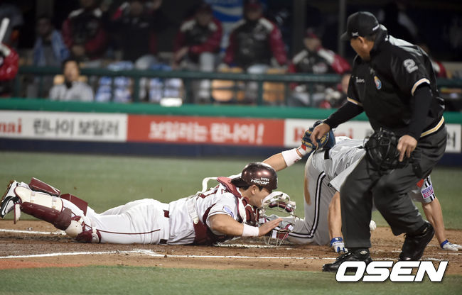28일 오후 서울 목동구장에서 열린 한국야쿠르트 세븐 프로야구 플레이오프 2차전 넥센과 LG의 경기,5회초 1사 2,3루 오지환의 1루 땅볼때 3루주자 스나이더가 홈들 파고들고 있다. 타임은 아웃이었지만 박동원 포수가 공을 놓쳐 세이프 됐다.