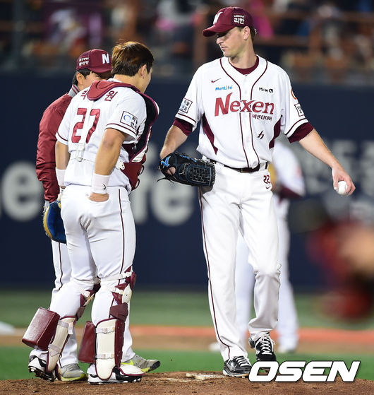 28일 오후 서울 목동구장에서 열린 한국야쿠르트 세븐 프로야구 플레이오프 2차전 넥센과 LG의 경기, 5회초 넥센 선발투수 밴헤켄과 박동원 포수가 이야기를 나누고 있다.