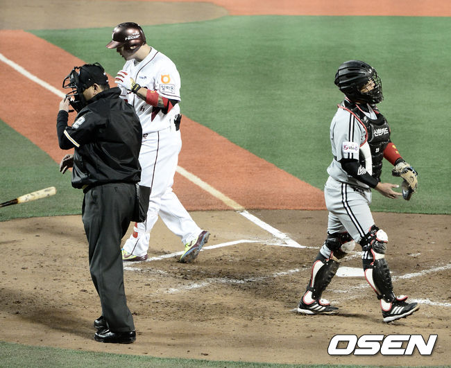 [OSEN=목동, 지형준기자] 28일 오후 서울 목동구장에서 열린 '2014 한국야쿠르트 세븐 프로야구' 넥센 히어로즈와 LG 트윈스의 플레이오프 2차전, 4회말 2사에서 넥센 박병호가 삼진으로 물러나고 있다.