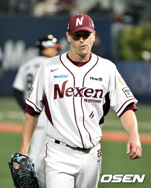 28일 오후 서울 목동구장에서 열린 한국야쿠르트 세븐 프로야구 플레이오프 2차전 넥센과 LG의 경기,7회초 수비를 마친 밴헤켄이 더그아웃으로 이동하고 있다.