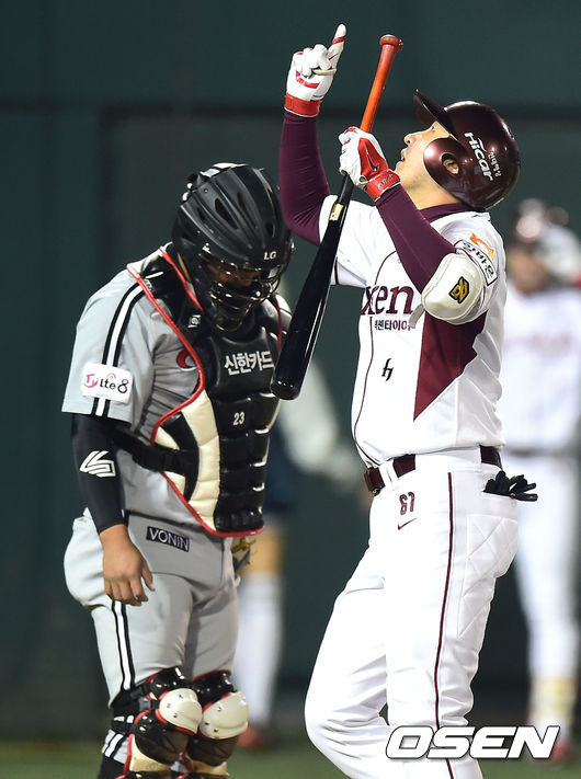 28일 오후 서울 목동구장에서 열린 한국야쿠르트 세븐 프로야구 플레이오프 2차전 넥센과 LG의 경기,7회말 1사 넥센 유한준이 솔로홈런을 날리고 홈에서 세리머니를 하고 있다