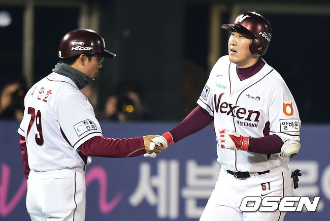 28일 오후 서울 목동구장에서 열린 한국야쿠르트 세븐 프로야구 플레이오프 2차전 넥센과 LG의 경기,7회말 1사 넥센 유한준이 솔로홈런을 날리고 베이스를 돌고 있다.